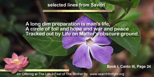 "Por longo tempo, repousei numa condição do que se pode chamar de sono profundo. Mas não era ‘sono’ como na terra. Você compreenderá somente quando vier a experimentá-lo pessoalmente. Eu não tinha nenhuma intenção de sair desse ‘sono’. Porém, Sri Aurobindo despertou-me a seu próprio modo e recomendou-me: ‘Agora, você tem duas coisas a fazer. Primeiro, há na terra muitas crianças que me pertencem, mas somente algumas delas estão em busca de minha luz. Destas, apenas umas poucas sabem o que é a minha luz. Por estas crianças você não precisa fazer nada. Quanto àquelas que estão buscando uma nova luz, você deve guiá-las, permanecendo apenas aqui, da mesma maneira como eu o ajudei a pintar. Eu próprio estou realizando este trabalho. Quando for à terra, você o verá em diversos lugares’." Em seguida, aquela forma fascinante dirigiu-se novamente a mim: "Venha, agora vou mostrar-lhe minhas pinturas. Tente compreendê-las tão bem quanto puder, de acordo com a sua própria capacidade. Mas não faça nenhuma pergunta". Vendo algumas das pinturas, fiquei simplesmente tomado de alegria e despertei. Alguém me dizia: "Não é permitido sentar-se na grama". Estava claro para mim que eu não devia ver mais – isso havia ocorrido como pretexto.