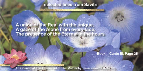Vi a cerimônia de Fundação de Auroville, em 28 de Fevereiro de 1968, da mesma forma como a ouvira ser narrada à Mãe na época. Mas agora, eu via tudo com uma significação interior. Vi a Mãe situada exatamente acima de cada jovem participante da cerimônia, com Seu beatífico sorriso, cheio de suprema doçura. Ela irradiava, juntamente com o Seu Amor Divino, uma brilhante luz dourada. Isso me fez lembrar a Ras Lila de Krishna. Cada participante sentava-se sobre um leão, e, portando a bandeira do seu país numa das mãos e uma porção de sua terra na outra, marchava para a Urna de Fundação. A visão toda era magnífica. Os leões eram extremamente belos e majestosos, e possuíam uma cintilante cor dourada. Suas imensas jubas quase tocavam o solo. Toda a atmosfera estava impregnada de uma substância invisível. Este dia 28-2-68, foi único na história do mundo – como expresso num antigo ditado Sânscrito, que diz: "na bhuto na bhavishyati" – jamais aconteceu antes e nunca voltará a acontecer no futuro!