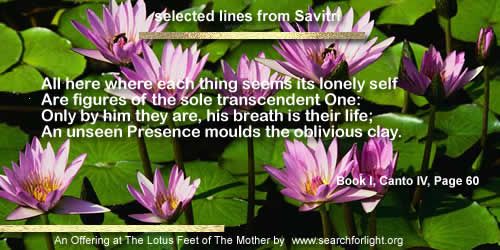 All extracts and quotations from the written works of Sri Aurobindo and the Mother and the Photographs of the Mother and Sri Aurobindo are copyright Sri Aurobindo Ashram Trust, Pondicherry -605002 India. |