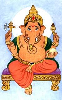 Shiva et Pârvatî used to play with two sons, Ganesh and Kârtikeya. The gods had given them a marvelous fruit. Each boy wanted to get it for him alone. Their parents explained them that the nectar of the Supreme Knowledge and of Immortality was hidden in that fruit. To get the fruit, both had to compete. The winner should run three times around the world and come back first. Kârtikeya left at once. Riding his peacock, he flew in the sky, stopping at every sacred place on his way, praying and worshipping the gods. Ganesh was fully aware of his stout body; it slackened off him badly. The rat, his vehicle, was rather slow and would not be able to beat Kârtikeya. But his wisdom suggested him the right solution. He turned round his parents, Shiva and Pârvatî, showing a deep devotion. When they asked him why he did not start his journey around the world, he replied : "My parents Shiva and Shakti are the Whole Universe. In Them is located the World. He do not need to go farther". Of course, he won the contest, ... and the fruit . This legend emphasizes the importance of cleverness; Ganesh is a strong symbol of this quality which is always the best against force, speed or physical strength.