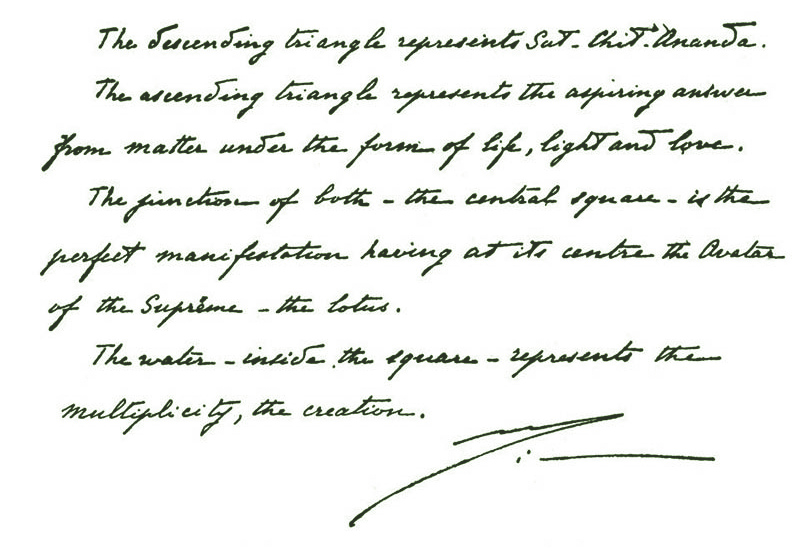 A symbol like Sri Aurobindo's as finally defined was used as early as 1902 by the "Cosmic Movement", a Paris-centred organisation which had as its head Max Theon, for some time the Mother's instructor in occultism. "Most of the cosmic writings [the various writings of the Movement] were unsigned," explains Pascal Themanlys, the son of a disciple of Theon. "The six-pointed star containing a lotus in its centre alone served to certify the authenticity of the texts. This sign evokes among other things the union of the active and passive principles and doubtless also the Wisdom of Chaldea, of Egypt and of Hindu India."